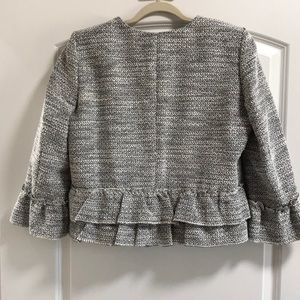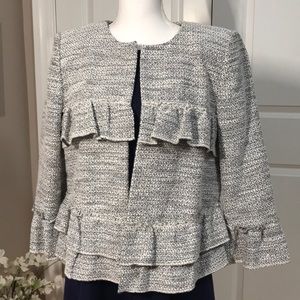 Chic LOFT jacket with elegant ruffle details. Perfect for layering.