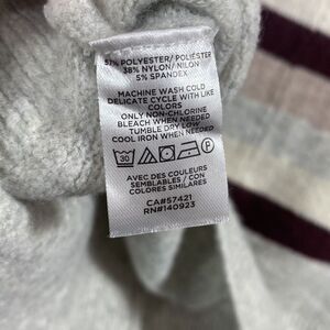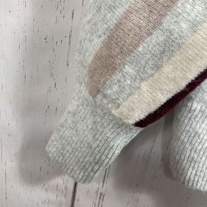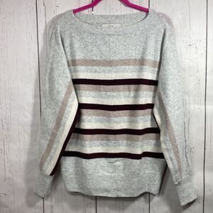 Soft and classic LOFT sweater featuring a gray heather knit with horizontal stripes in taupe and burgundy tones. Designed with a relaxed fit, ribbed cuffs and hem, and a comfy crew neckline. Perfect for layering through fall and winter — easy to style with jeans or trousers for an elevated casual look.