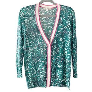LOFT Green Pink Paisley Ramie V Neck Button Front Sheer Long Sleeve Cardigan M