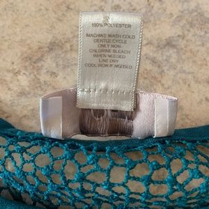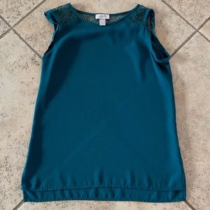 LOFT Green sleeveless top. Crocheted detail on shoulders that span the length of the back collar. True color is more of deep forest green and not a teal as the picture seems to show. 100% polyester. Size XS.