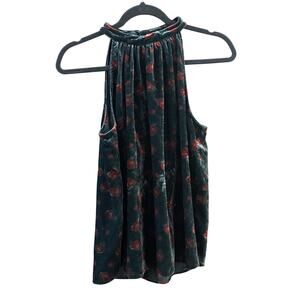 LOFT Green Velvet Red Rose Shirted Halter Top Sz M High Neck Christmas Party