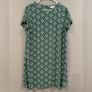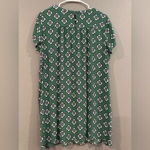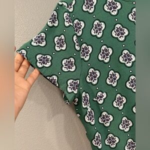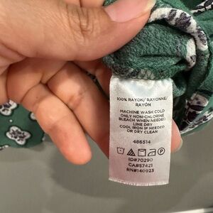 Chic dress with a green base and black floral motifs. Short sleeves add elegance. 203