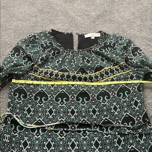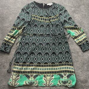 Charming dress with intricate green and black patterns. Comfortable and stylish.