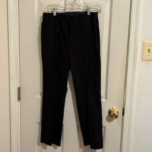 Worn once and has been hanging in my closet! Really flattering kick crop black pants - skinny leg with flare at hem and a raised seam on the front of the legs. Features an elastic band in the waist, and sits high waist. Pictures show the hidden button closure and zipper on the side as well as the raised seams, back welt pockets and product and fabric care.