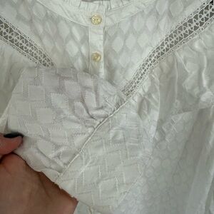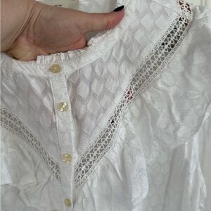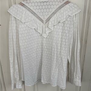 Chic ivory blouse with textured pattern. Features ruffled neckline and lace trim. Ideal for versatile styling.