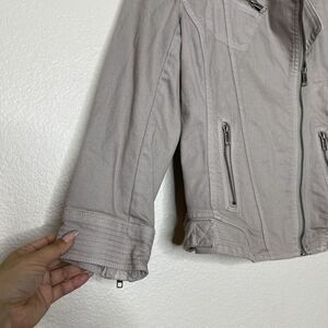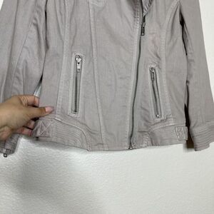 LOFT Jean Jacket Size 2 Khaki Taupe Stretch Moto Zipper Pockets Asymmetrical Zip