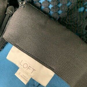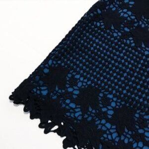 LOFT knit teal/blue A-Line skirt with black floral crochet/lace overlay detail.