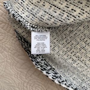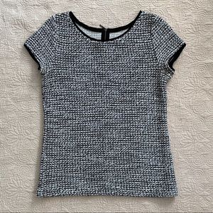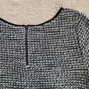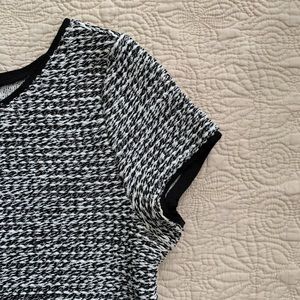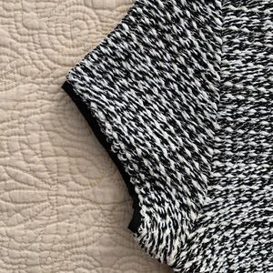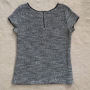 Black and white knit shell top with ribbon detail on neckline and sleeves. Exposed zipper in back.