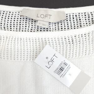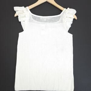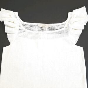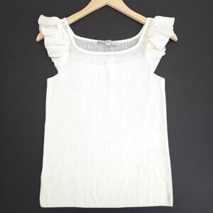 LOFT Knit Top S White Square Neck Flutter Crochet Pom Preppy Resort Casual