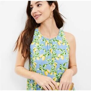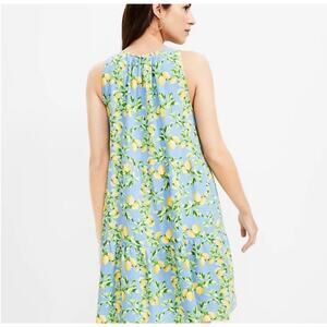 LOFT Lemon Print Tiered Swing Dress Women's Small Blue Yellow Linen Blend