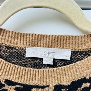 Stylish leopard print sweater. Features bold black spots on a tan background. Long sleeves with ribbed cuffs. Perfect for a chic look.