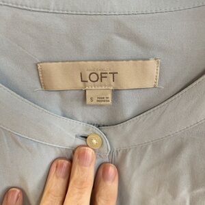 LOFT lightweight blouse in a soft light blue shade, size small. Features a flattering gathered neckline, partial button-front closure, and roll-tab sleeves for versatile styling. Perfect for work or casual wear. In great pre-owned condition!