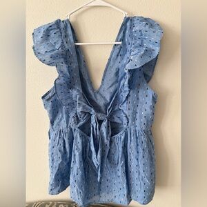 Elegant light blue blouse with ruffled sleeves. Perfect for casual or dressy occasions.