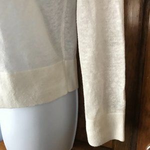 Ann Taylor LOFT; Cardigan Sweater; White; Petite Medium; Lightweight; Button Close; Ribbed Cuffs and Hem; NOTE: Small stain on back neckline - See photo; 55% Linen & 45% Polyester; Machine Wash & Dry Flat; Armpit to Armpit 20"; Armpit to Hem 15"; Sleeve 18"; Length 22"