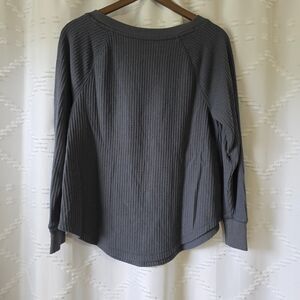 Long-sleeve charcoal gray waffle knit shirt with relaxed, casual fit, a wide crew neckline and raglan-style sleeves for a laid-back look. Textured thermal pattern, gives it a super cozy, comfy feel. The hemline is rounded, adding a subtle touch of shape - perfect for layering top or on its own for comfortable everyday wear in fall or any season.