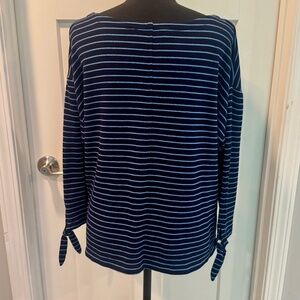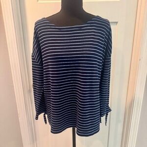 LOFT Long Sleeve Tee, Size M, EUC. Navy stripe tee has ties at cuff and straight hem. Boat neck collar. Boxy shape, relaxed fit. Measures: 21" arm pit to arm pit and 21" length. kd