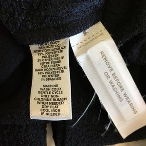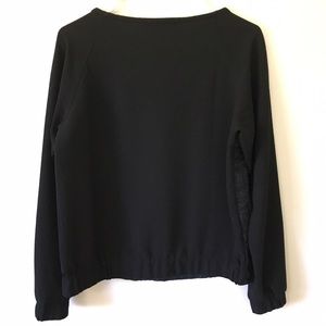 Perfect long sleeved shirt, damask navy blue with slight sparkle on front, elastic around waist and wrists, light-weight black sleeves and back. So pretty. Size Small. Length 23", sleeves from top of neckline is 26", bust is19"