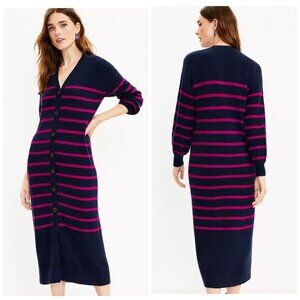 LOFT Long Sweater Cardigan Midi Dress Striped Navy Blue Button Front