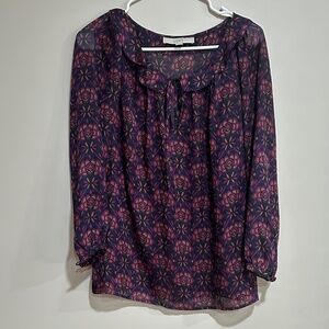 This shirt is a little sheer. The colors would go great with black slacks. It's a very versatile piece.