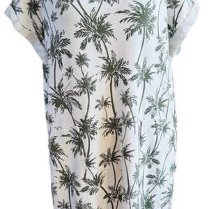 Stylish terry cloth mini dress with tropical palm design. Features short sleeves. Ideal for casual wear. New condition from smoke and pet free home. 35 inches from shoulder to hem. 21 inches from armpit to armpit.