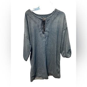 LOFT Lounge Tie Neck Tassel Denim Tunic Dress Pockets Size Medium 3/4 Sleeves