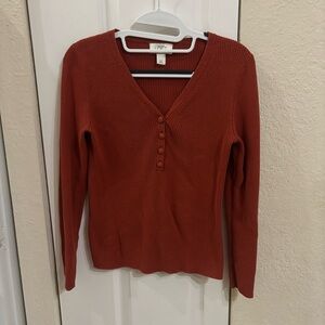 Chic rust sweater with ribbed texture. Ideal for layering. Almost a Henley look.