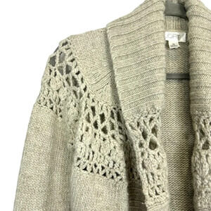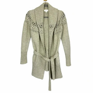 LOFT Merino Wool Blend Long Belted Cardigan XS Crochet Knit Shawl Collar