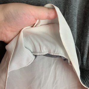 --Grey sweater over white/cream smock-like material