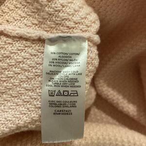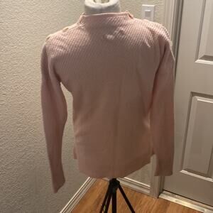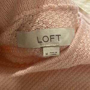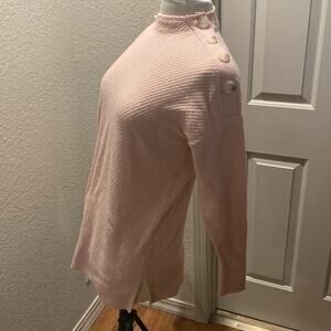 LOFT light pink knitted pullover long sleeve mock neck sweater w/ 4 white & brown buttons on each shoulder. So cute!!! Oversized. Comfy & casual.