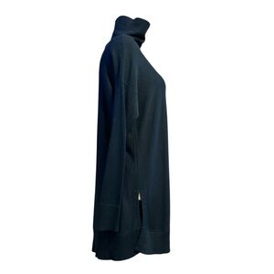 Sleek yet slouchy dark teal tunic. Light gauge horizontal rib knit with contrasting hem and cuff ribbing Features deep 8” side slits. Very soft.