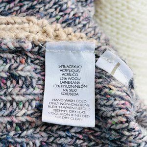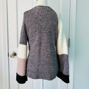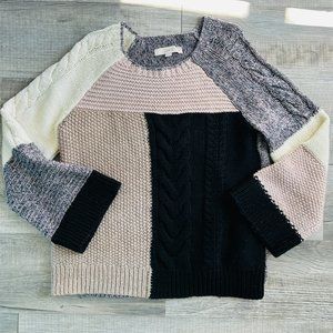 Ann Taylor Loft modern patchwork multi color sweater in size medium. This comfy pullover sweater has a slight oversized fit. Infused with a luxe touch of silk, mixed textures and versatile neutrals turn this soft sweater into an artfully modern patchwork.