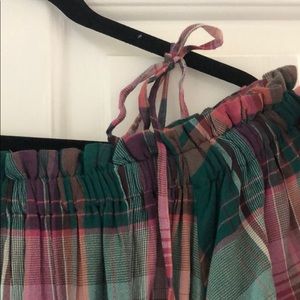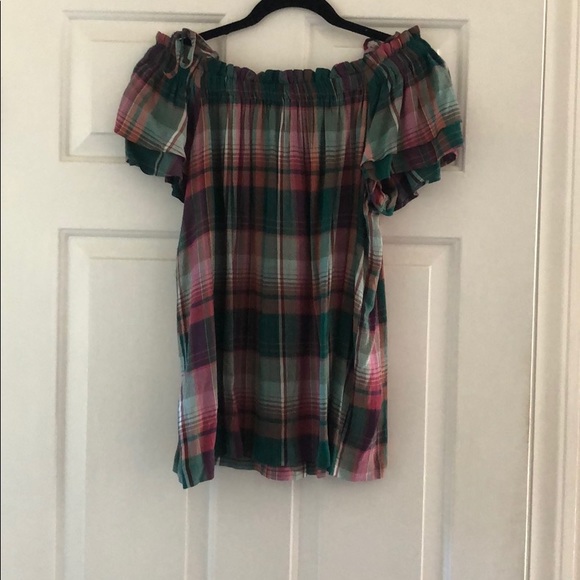Worn only once. LOFT blouse with off the shoulder sleeves and ties. Beautiful color palette and great for spring, summer or fall.