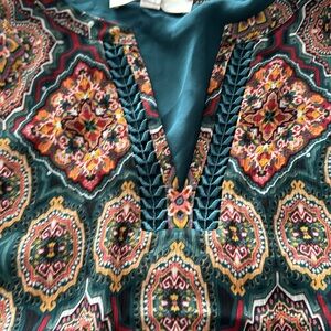 Vibrant blouse with intricate patterns. Features a mix of colors. Perfect for a bold look.