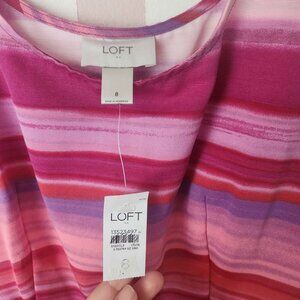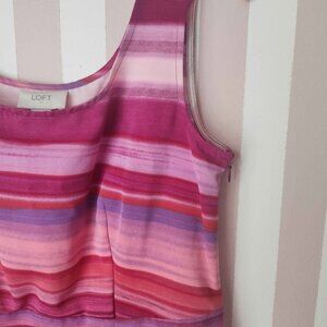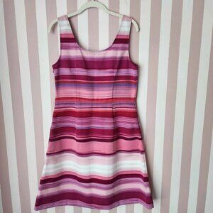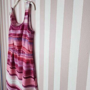 Sleeveless dress with vibrant stripes. Features shades of pink and purple. Perfect for casual outings.