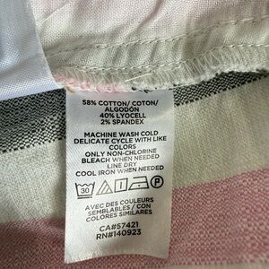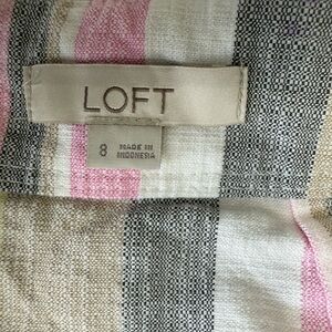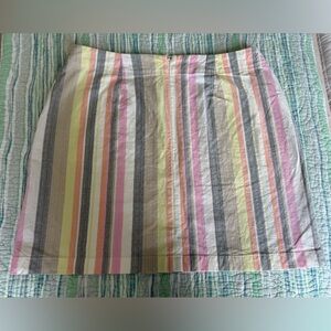 Chic skirt with vibrant stripes. Features pink, gray, and cream tones. Ideal for casual wear.