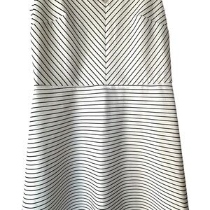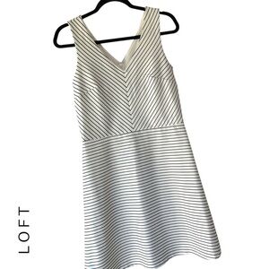 Stylish LOFT dress with a flattering V-neck. Features black stripes on a white background. Perfect for any occasion.