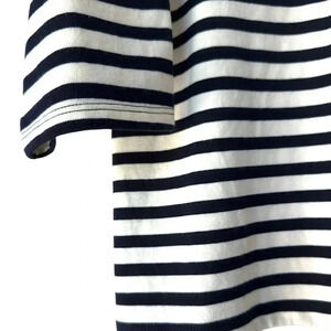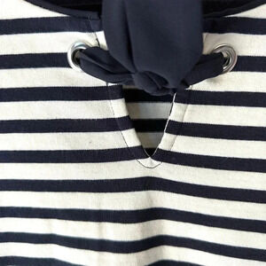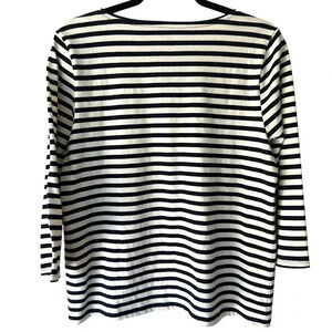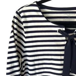 Talbots classic navy blue and white stripe top | Rounded neckline with grommet and tie closure | Three quarter length sleeves | 100% cotton