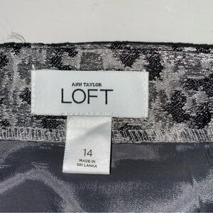 The Loft NWOT Metallic Leopard Animal Print Pencil Skirt in size 14 is a stylish and versatile piece perfect for various occasions such as travel, weddings, parties, casual outings, and business meetings. Made from polyester and nylon with a metallic fabric type, this knee-length skirt features a sleek straight and pencil style with a zip closure. The leopard print in grey and silver adds a touch of luxury and sophistication, making it a standout piece in your wardrobe. Dry clean only to maintain its quality and ensure longevity.