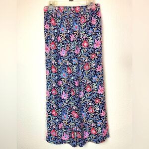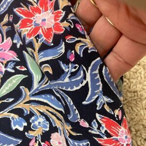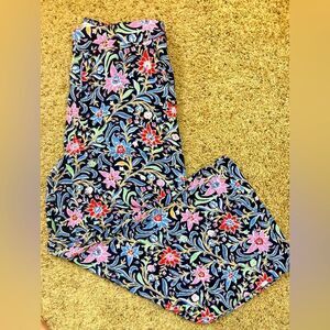Beautiful red, pink, periwinkle flowers on navy background. Wide leg rayon pants. Great pockets. Almost British floral. Never worn. Still has strip intact but tag got pulled off. Waist is 14” has elastic back of waist. Rise is 11” so high waist. Inseam is 26”. Top to bottom 36”. Please go by measurements more like S or smaller M. Garden party, work, travel. Marked XS note I’m marking S. So please go by measurements🌹ty.
