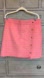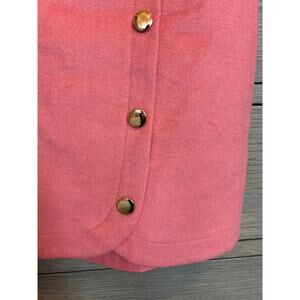 This is a short, A-line wrap-style skirt in a warm coral-pink color. It features a side button closure with a row of shiny gold-tone buttons that add a decorative detail while securing the overlapping front panel. The hem has a subtle curve where the wrap overlaps, giving it a slightly flared and feminine silhouette. The fabric appears to be soft and structured, possibly a wool or wool-blend felt, making it suitable for cooler weather.