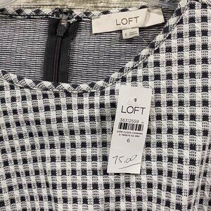 Fresh and polished with a vintage wink. New with tags LOFT dress in a black-and-white gingham textured knit. Scoop neck, short puff sleeves, seamed waist with soft pleats, and a back zip for a clean fit. A-line silhouette that skims without clinging—easy for workdays or weekend plans. Size 6. NWT; crisp and ready for your closet.