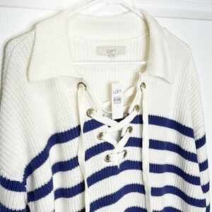 LOFT NWT Striped Lace Up Polo Sweater Women's Medium Blue White Nautical Preppy