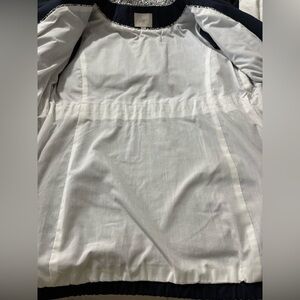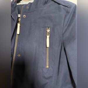 Loft navy full zip closure, gold-toned hardware (zippers and snaps), and a patterned lining in the hood. It also features decorative toggle closures at the drawstring waist. Features front pockets and drawstring waist. Ideal for casual wear.