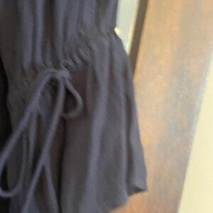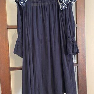 Pullover shift dress with stretchy off the shoulder neckline. Beautiful white and navy blue circle lace details around shoulders. Elastic at sleeves with ruffle at ends.