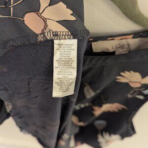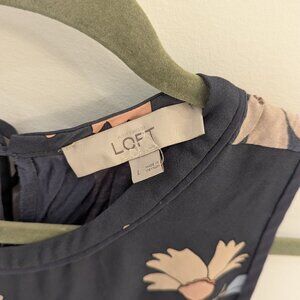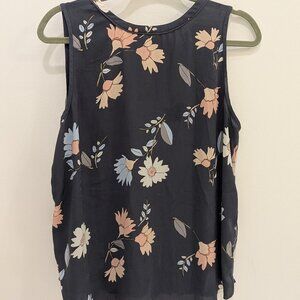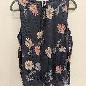 LOFT Navy Blue Seeveless Blouse with Floral Pattern and Keyhole Tie in Back