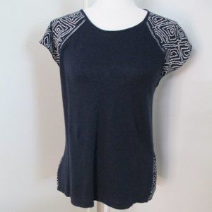 LOFT Navy Blue Tee Shirt Geometric Printed Cap Sleeves and Back Peplum Size SP