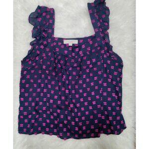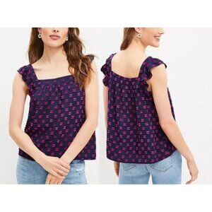 LOFT Navy Blue/Pink Clip Ruffle Square Neck Ruffle Sleeve Festival Top Size L