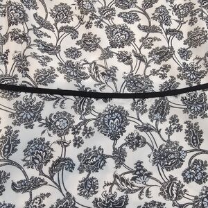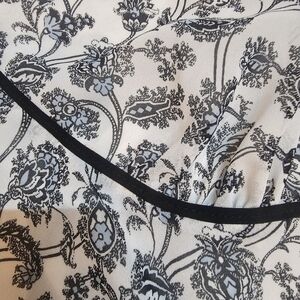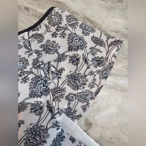 This beautiful Ann Taylor LOFT blouse in size 14 features a navy blue floral print on an ivory background with a sheer overlay and full lining. Faux wrap-style neckline and piped trim give it a flattering, feminine touch. Lightweight and polished—perfect for the office or weekend outings. Excellent condition with no flaws.