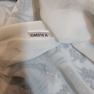 Features: Navy floral pattern on ivory base, sheer overlay with lining, faux wrap neckline, cap sleeves, piped trim detail