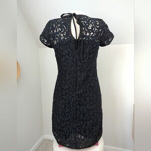 A beautiful dainty dress made with a large lace print over a black spaghetti strap slip connected to the exterior dress.